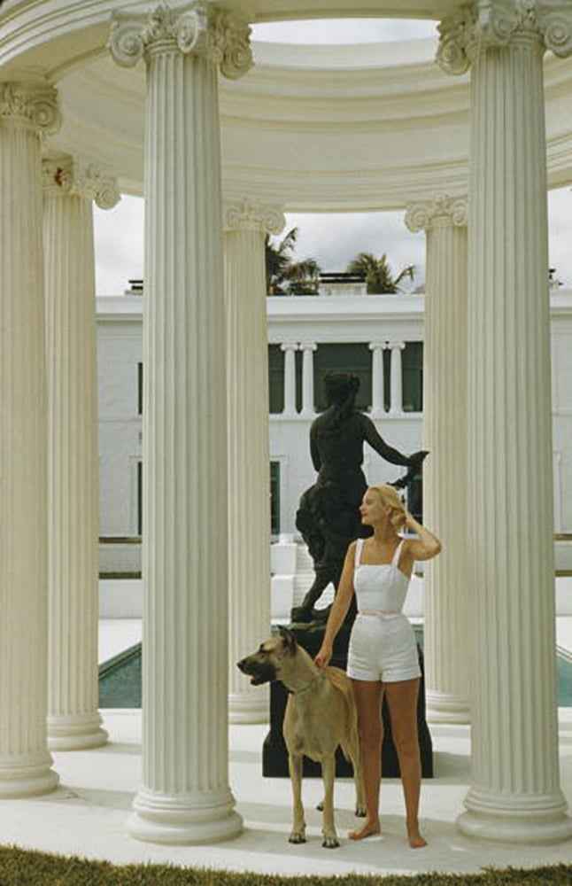 American socialite Mrs. Winston F. C. Guest (aka C. Z. Guest, 1920 - 2003) with a Great Dane at her ocean-front estate, Villa Artemis, in Palm Beach, Florida, 1955. (Photo by Slim Aarons/Getty Images)
